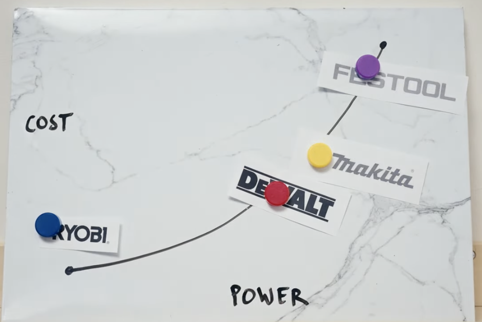 Here's my attempt to map these power tools on the cost versus power curve. Start with Ryobi on the bottom left: Low power, low cost. Makita is in the middle, pretty decent. And then up towards the top right you're approaching the diminishing returns with Festool. But then I think DeWalt sits squarely in the middle, which is why I love it.